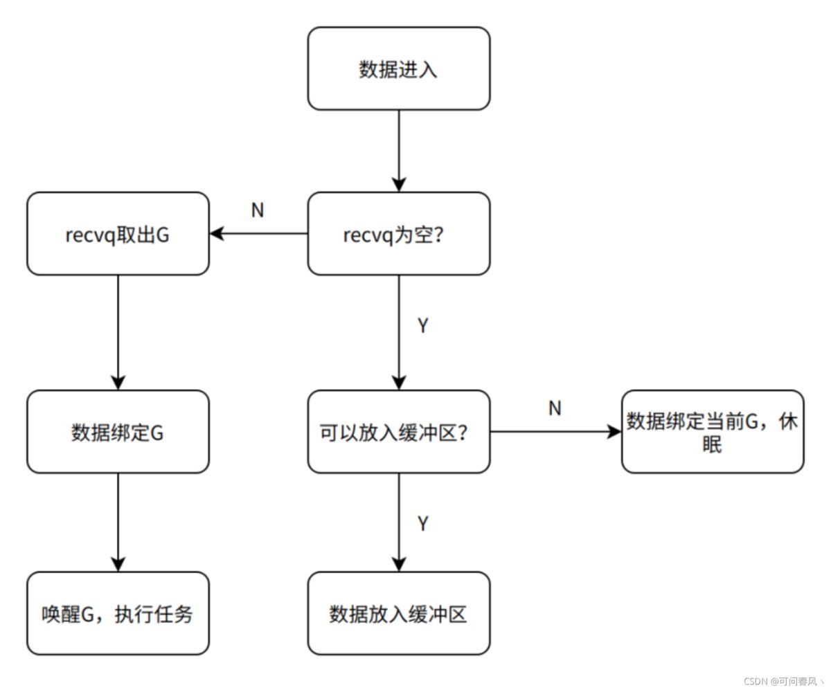 - 如果sendx为空且缓冲区为空,将该G放入recvq,进入休眠,等待被唤醒。