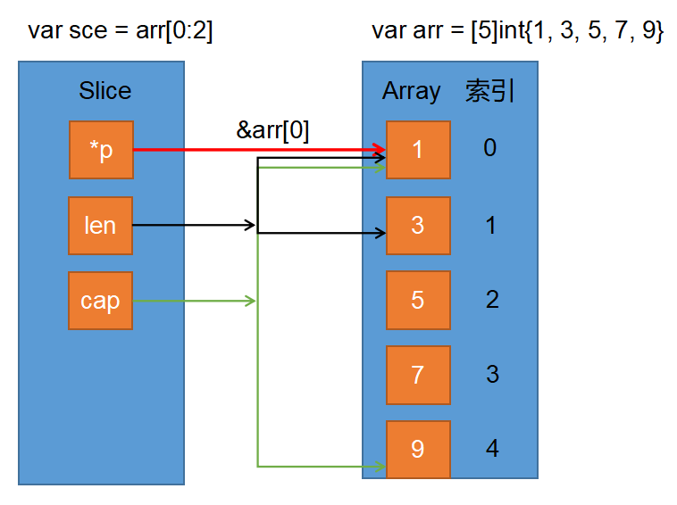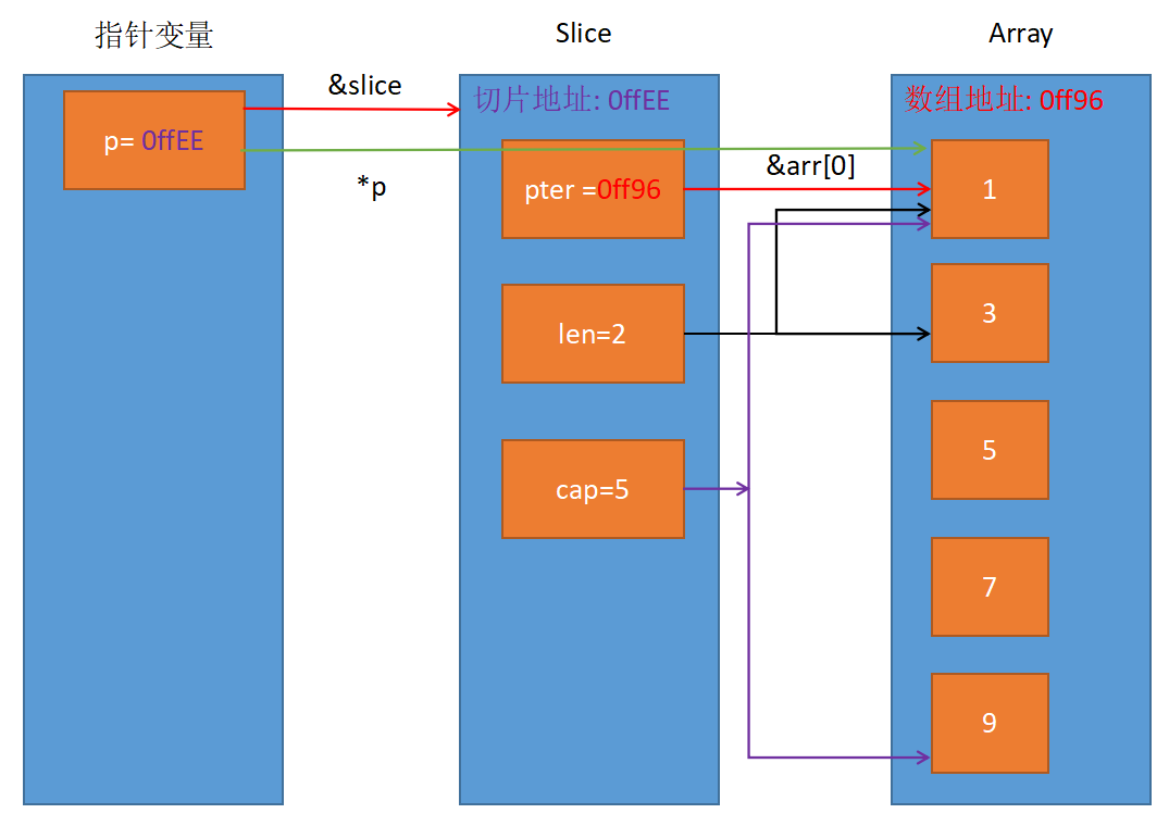 - 值得注意点的是切片的本质就是一个指针指向数组, 所以指向切片的指针是一个二级指针