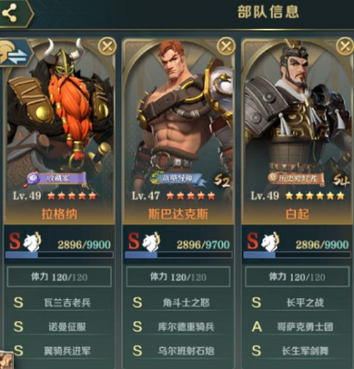 在这套阵容中,白起作为辅助,主要提供使敌方跳过回合的恐怖效果,斯巴达克斯为队伍提供连击次数,同时携带增益技能为主将提供力量加成和伤害补充,而主将天命拉格纳的自带技能可以使自身突击伤害无视目标防御,配合相关技能可以打出极其爆炸的输出。