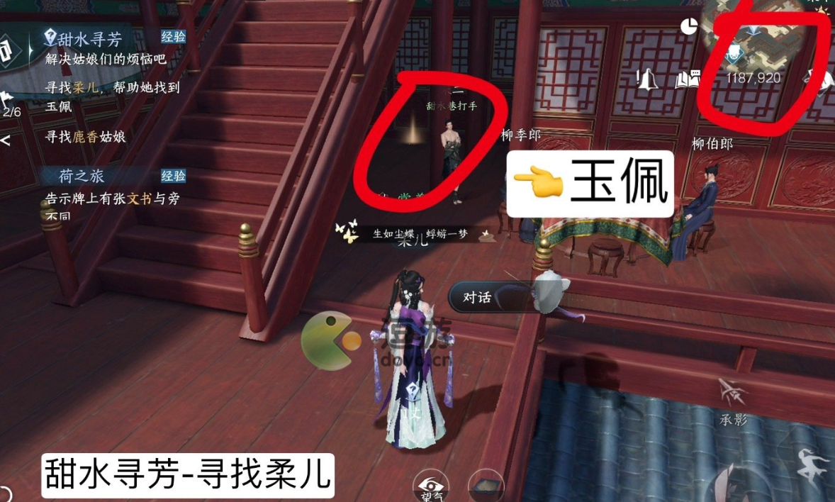 2、寻找柔儿:前往汴京(1187,920) ,找到柔儿NPC;跟柔儿对话可知她的玉佩丢在附近,开望气可在后方楼梯下找到,交还即可。